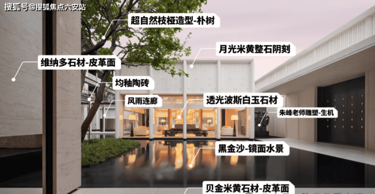 归家体验营造尊崇礼仪序列。西侧主入口的"静藏琉光"大门营造威仪与灵动的第一印象。归家路径通过风雨连廊体系实现"不走回头路",电梯厅与客厅采用同款石材通铺,强化专属归属感。社区巧妙融合风雨连廊、架空层与下层式庭院等设计,模糊自然与建筑的界限,同时借鉴中式框景、借景、对景的精髓,打造出园中有园、移步换景的雅致意境。