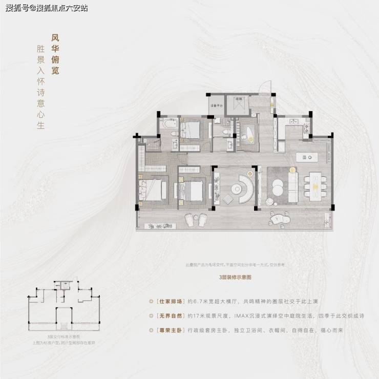 独门独院,超大庭院,天人合一的居住境界;三层合院,一层一世界,盛载家族生活;L型空中大阳台,纵览天地的雄壮胸襟;澄心合院仅此17席,无以复制的城心孤品。