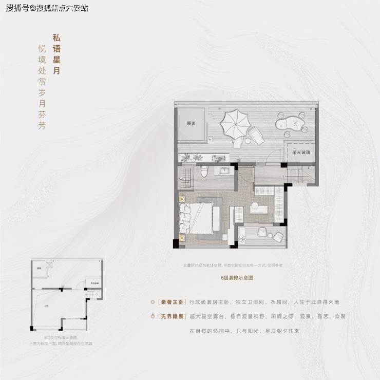 综合得房率约110%,空间尺度媲美270㎡大平层!约17米IMAX级别星幕露台,约20-35㎡挑高地下室,独立入户花园。