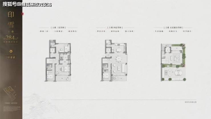 合院之中,中间套建面约296㎡,地上三层,四个卧室全部是朝南的套房,还是奢侈的双主卧配置,且每一间卧室都连接户外空间。