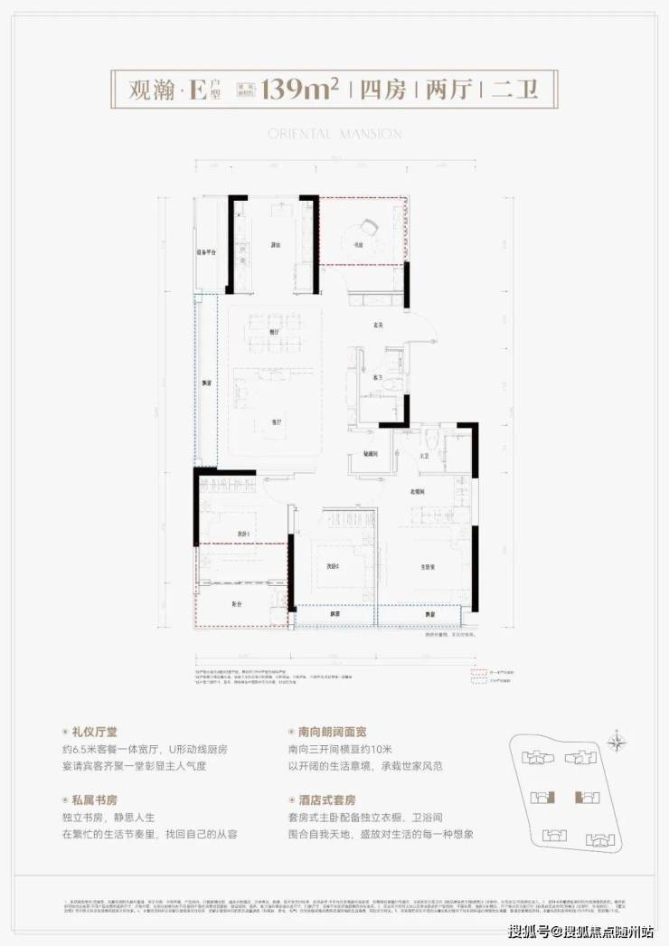 项目主打建面约103-139平方米三房至四房,所有户型均实现高利用率布局。约103平方米户型做到三开间朝南、U型厨房与主卧套房设计;约139平方米户型为四房两厅两卫,客厅面积约37平方米,满足多代同堂需求。通过飘窗全赠送、阳台半赠送政策,得房率高达约90%-94%,远超市场平均水平。