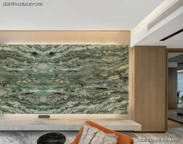 点睛之笔,是公区背景墙的巴西进口石材天宝石,纹理与色泽好似青绿山水,质地却温润如玉,正是观云钱塘城的同款。