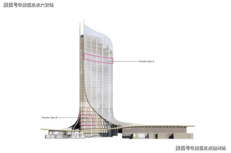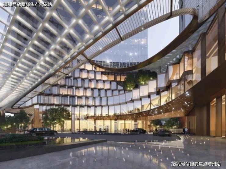 其中,天幕和立面设计体现了超高标准的工艺,强化了创新性以及创造开放姿态的建筑理念,同时与城市肌理和文化融为一体。巨型天幕沿着酒店塔楼立面顺流而下,在低区如双翼般展开形成曲面。