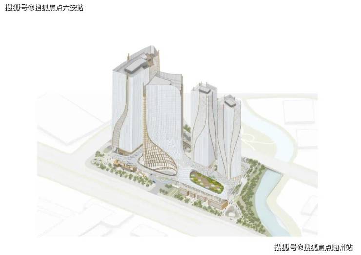 巨型天幕沿着酒店塔楼立面顺流而下,在低区如双翼般展开形成弧面。帷幕流线体现了杭州的刺绣传统,而连接四座塔楼的弧形水平面则延续了这一主题,这个水平弧面向四座塔楼动态环绕后,塑造了各功能之间的链接纽带,并勾勒出内外部庭院的轮廓。使得整体外观流畅且具有连贯性。