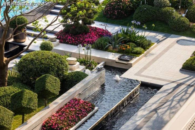 泳池西侧,一座由香槟金金属与美国灰麻石材打造的对称式景观廊架巍然矗立,成为整个水景的尊贵焦点。