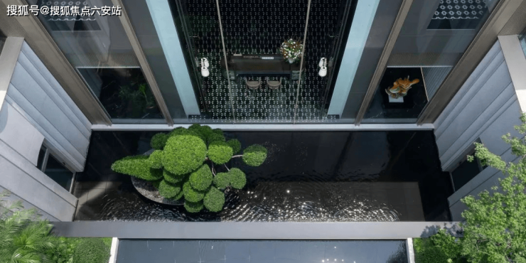 入厅视线正对一方天井,俨然一幅立体的山水长卷。跌水墙如银帛垂落,在镜面池中激起细碎清响,右侧的矗立着精致的跌水树池,一株苍劲的松斜探而出。这"一瀑一松"的景致,刚柔相济,方寸天井之间,收尽林泉大观。