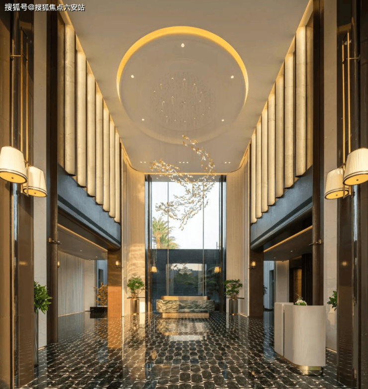 走近看,4根奢石雕琢的罗马柱优雅伫立,架起约9米高的门头,金光穹顶在两旁镜面水景的倒影下,流光溢彩,潺潺流水更在此隔绝了车马喧嚣,一踏入就恍若置身迪拜帆船酒店。若此时抬头,就能看到遥相呼应的高层立面:基于简约利落的轮廓,高层主体采用大面积铝板+玻璃,局部涂料的设计。