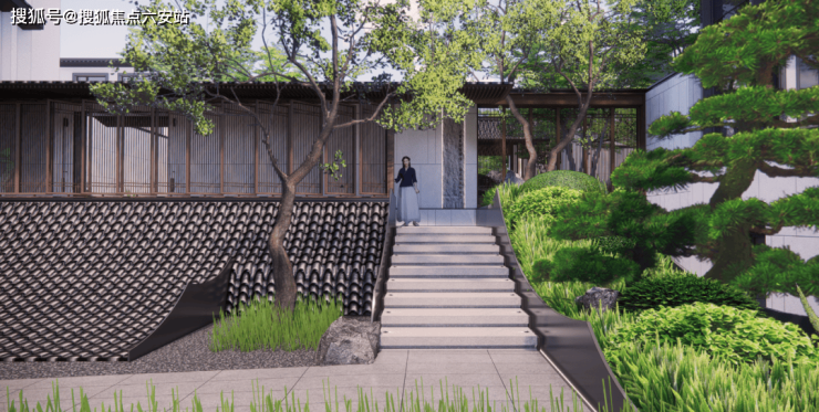 雍翠别院的中式并不仅仅是做几幢中式风格的房子,中式的精髓更是被广泛运用于它的公区中。如果你去项目实地看下,一定会被入口界面攥住眼球。迎面而来的就是一大块的琉璃景墙,档次拉满,拾级而上,到处是屋瓦铺陈的漂亮景观,绿植穿插其间,主打一个“归家即度假”的松弛氛围感。