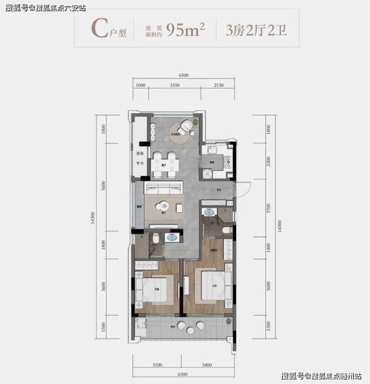 在建面约65㎡主力户型中,可以打造一厅一卧朝南及儿童房的日常居家空间;亦可将最好的风景山色留给生活,实现双卧朝南的空间格局,随心而变。
