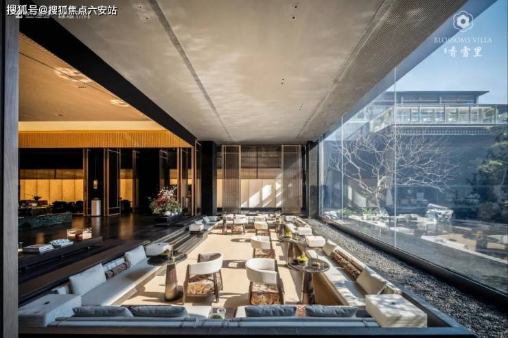 就连地面也以梅花为灵感,嵌入梅花纹样,以及下沉庭院地上的石材拼花、廊架上的格栅构图、挂灯图案、地灯印花……踏雪寻梅,步履成诗。难得的还有,室内室外边界消融,无界交互,无论在哪个角度,都可见理水叠瀑,多种梅花群芳争艳,水、花、树、建筑打造出独具江南意味的园林,就像把超山搬进了你家。