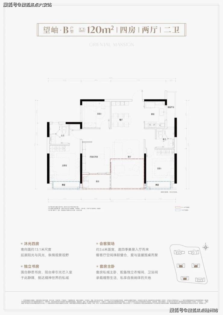 建面约120平方米户型则设计了四房且四开间朝南,南向采面极佳。而建面约139平方米大户型则打造四房两厅两卫,分为横竖两款,全部为边套,两梯两户设计。该户型得房率高达约93%,南向3个卧室,采光优良,客厅面积达到约37平方米,充分满足二胎家庭或三代同堂的居住需求。