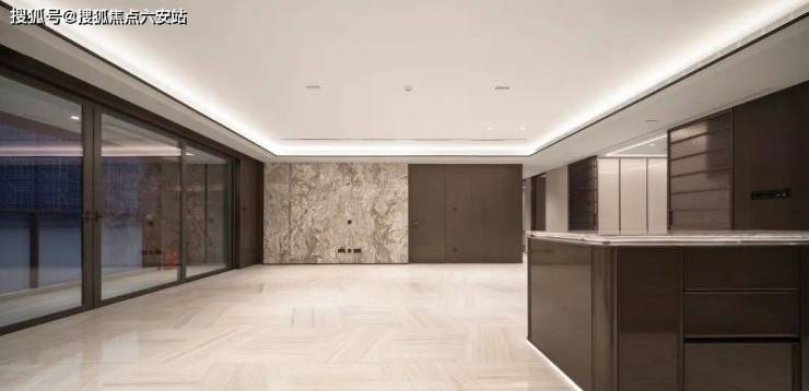 东方美学演绎。东方折扇艺术符号通过石材切割与拼接,将大量斜切及折叠元素运用到建筑外立面中,在自然光与夜景灯光呼应中显示不同时间的气质变化。外立面部分以灰白色调为主,材质以白灰多彩漆和铝板为主,搭配少量石材。古典石材立面镶嵌精致古铜色金属边框,营造出既经典又现代的建筑意象。这种设计不仅从外看艺术雅奢的外立面符合豪宅审美,更是为居住空间创造开阔的景观视野,兼顾了视觉的美学感及居住的舒适度。