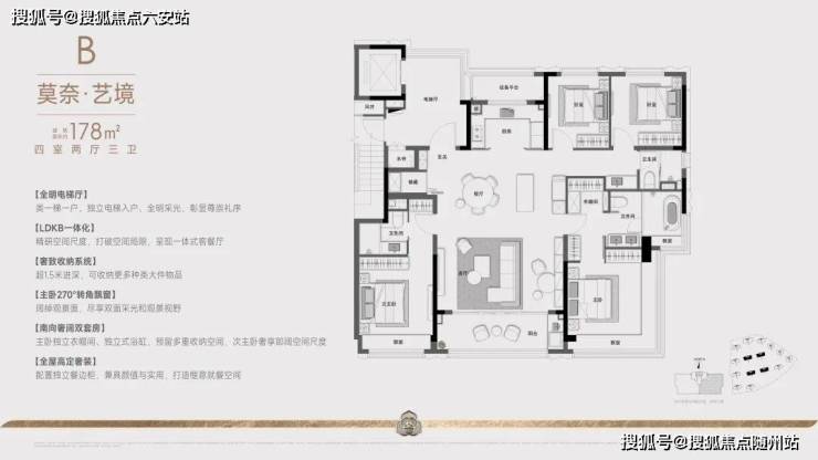 建面约178方四房两厅三卫:这款户型,则站在追求品质改善人群的角度,做出了四房三卫双主套设计。