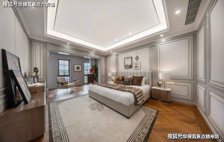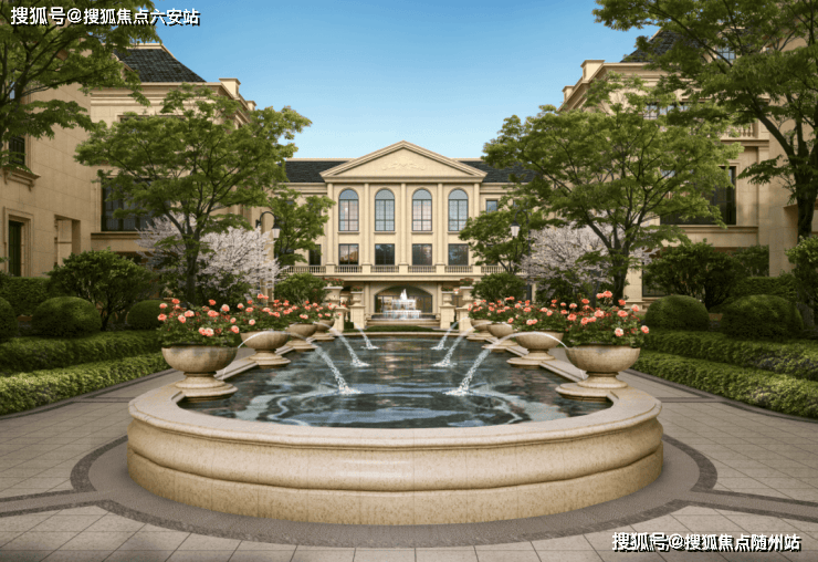 整个园区,以经典的绿城法式墅区景观大中轴贯穿,占地约1000多㎡,联排建筑的设计,融合了中国传统院落布局与法国枫丹白露宫的审美,外立面大面积采用全石材干挂,檐口等细节部位使用仿石。