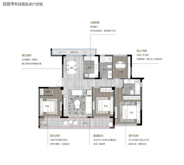 豪华主卧套房,约3.8米大开间,在呵护居住私密性的同时,亦能自成一天地,尽享非凡的私密空间与生活场面。