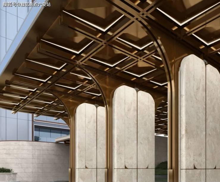 外墙以银白色铝板和大开间窗为主,结合层间深灰色金属线脚及陶金色格栅等元素,多处运用了弧形的元素,以极致窗墙比营造恢宏大气的国际气质。