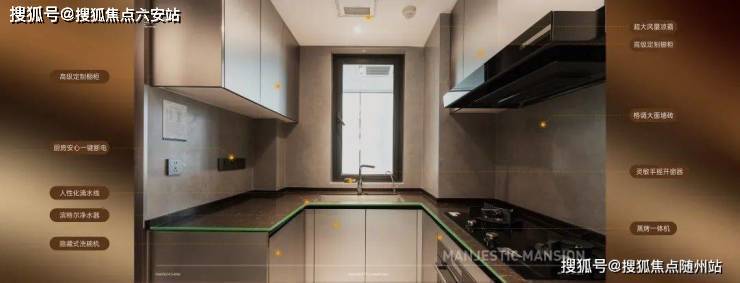 厨房区域,动线井然有序,细节处同样营造游刃有余的下厨体验。灵敏手摇开窗器、超大风量凉霸、厨房安心一键断电、高级定制厨柜、人性化滴水线、格调大面墙砖、防水开关插座、抽拉式便捷水龙头等,多达数十项细节,营造一气呵成的美好烹饪体验,安全从容、洁净清爽,调和出理想厨房的生活馨香。