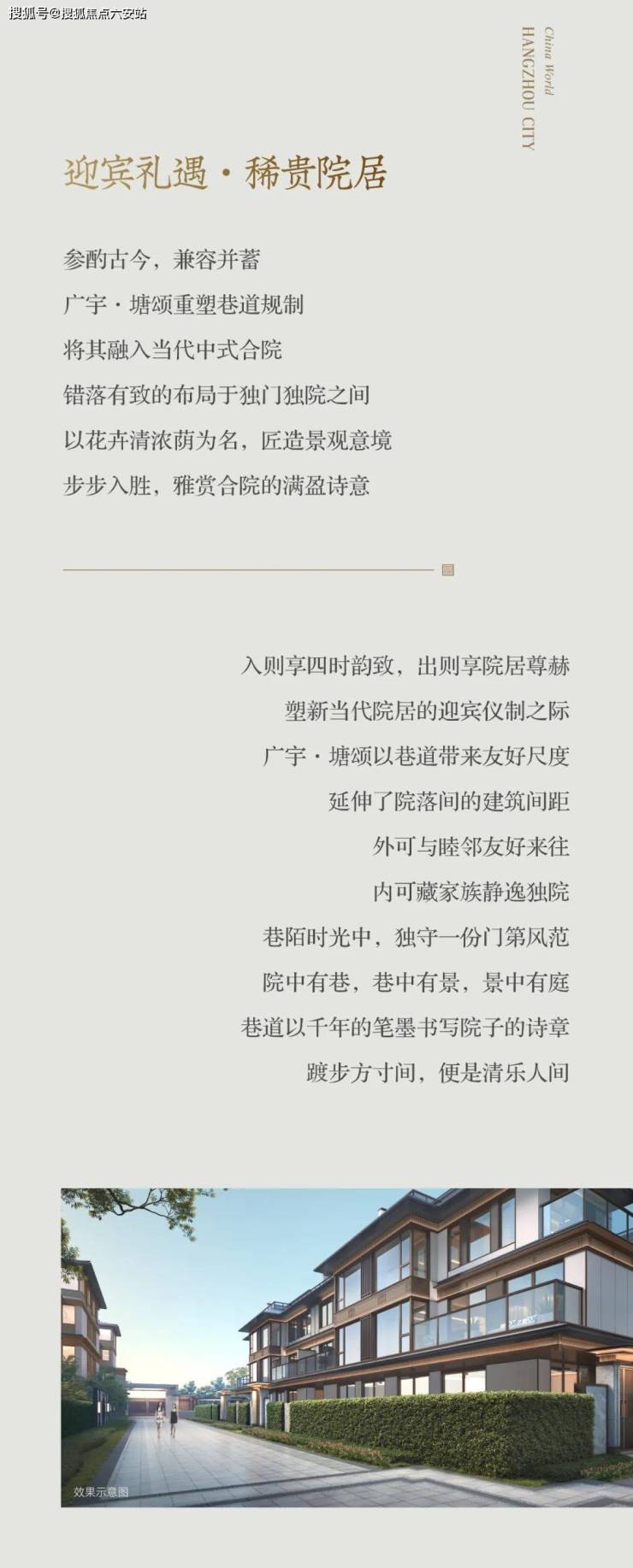 广宇·塘颂楼盘的出现为杭州临平塘栖古镇带来了全新的生活方式。中式合院的纯粹美学与当代生活的需求完美交融,在这里您将能够感受到宋风美学的独特韵味。同时,周边配套的完善与便利的生活环境,将使您享受到无与伦比的居住体验。来广宇塘颂,感受历史与现代的交融之美!