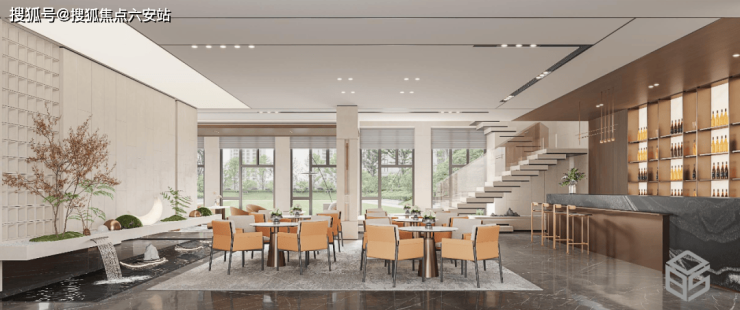 自然景观与纯粹的室内相交织,徐徐渗透出一缕惬意氛围。内敛的东方情怀在这一刻悄然释放,流动的水系也在静默涌动,同绿植景观造景共同打造轻松舒适的社交场景。