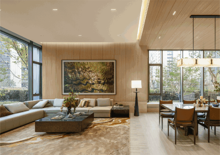 一路走到单元入户大堂,挑高设计搭配质感墙面与柔和灯光,没有冰冷的疏离感,反而像走进了星级酒店的大堂,让每一次归家都成为一场充满尊崇感的旅行。