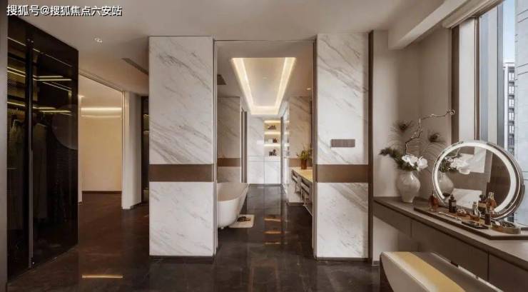 最大的主卧套间足足有55㎡,相当于把酒店行政套房搬到了家里。超豪华衣帽间,配置了男女主分开收纳区和化妆台;卫浴间用了高奢酒店同款双台盆和大浴缸;卧室全景落地玻璃窗。