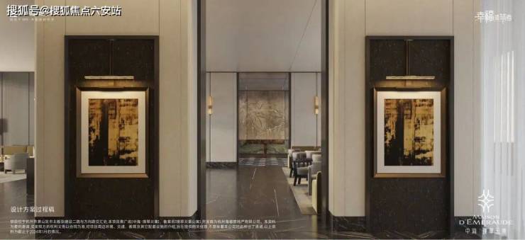 过程版效果图仅供参考 不代表交付标准为了实现尊贵雅致的归家仪式感,打造“五境归家”动线,约37米延展面的府院式大门、约4米挑檐星空顶及尊贵酒店式落客和parda绿奢石,勾勒出每一步皆静奢的归家质感。而在入户电梯厅,经典纹样的瓷砖拼花,搭配雪山银狐岩板和精美壁灯,让业主的每次回家都被温馨氛围包裹。