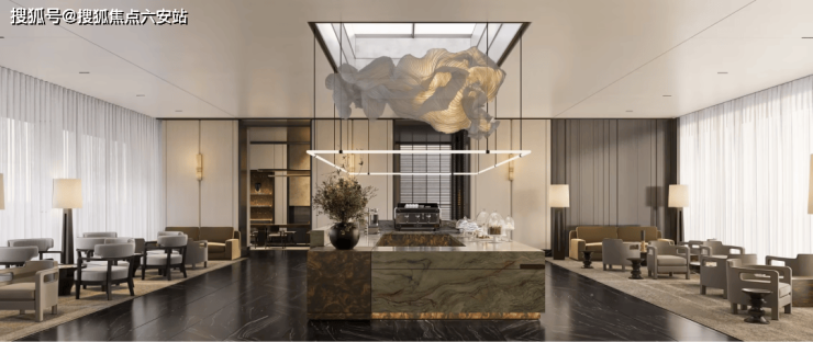 三境·社区大堂:丝绸奢石接待前台、天悦米白墙面+铂悦蓝地面,手敲铜与树瘤木打造的饮光Lounge水吧台、书语Zone静谧书吧,艺术感与奢华感并存;