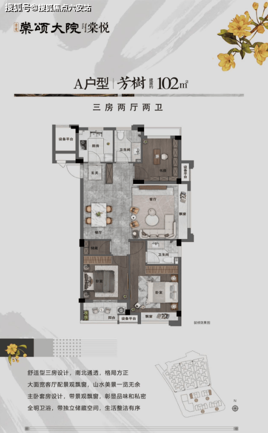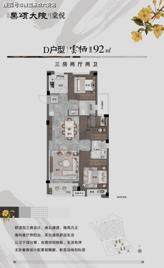 项目定位:临安滨湖新城唯一在售低密新中式合院社区,占地约1.7万㎡,容积率1.1,绿化率25%,规划4幢六层电梯洋房(92户)及41户新中式合院,主推建面约65-190㎡户型,总价65万起,现房交付。