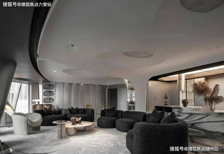 偶然、随机、浑然天成……像自然界的万物一般,室内空间受某种“牵引力”的作用自发生长,墙体交错蜿蜒,天花随之流动。马海毛沙发、洞石茶几、四叶草般沙发椅……