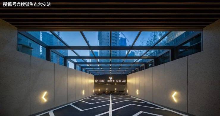 地下单元车马厅立柱由岩板砖装饰,顶面装有宽幅金属格栅吊顶,门厅绿植造景,智能人脸识别入户,人性化又富有极简美感。
