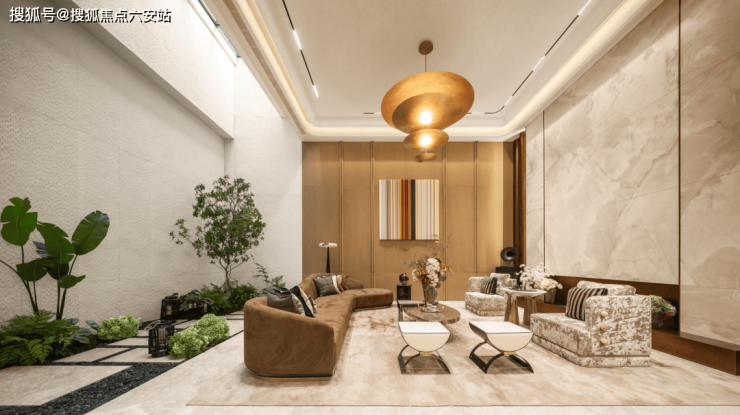 约43米恢宏门庭两侧黑松耸立,挑高约13米的归家大堂彰显尊崇礼序。中庭处约15米叠石飞瀑倾泻而下,与约1300㎡下沉式庭院共同构成三层立体观景式山水画境。