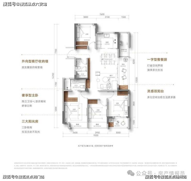 三房朝南,面宽约9.3米,户型设计双阳台双飘窗,能完美地将生活与休闲功能分隔开。主卧套房设计,尺度宽绰,带步入式衣帽间,处处彰显改善盘的空间感。