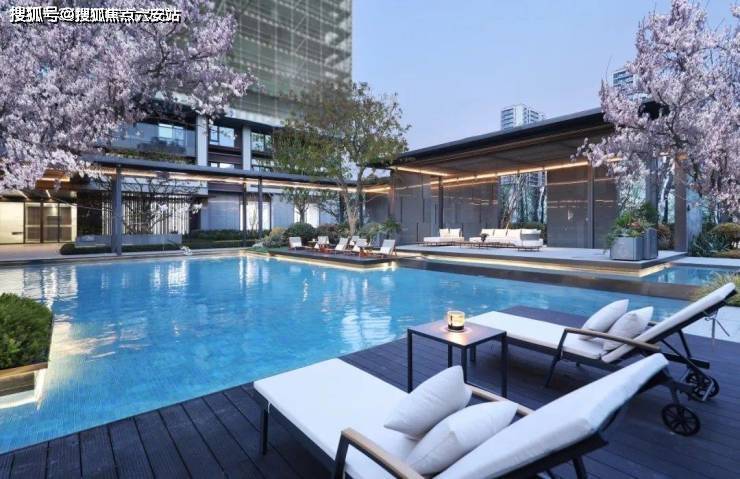活力剧场里设计了湛蓝的景观戏水池,水岸布置茶几休闲躺椅、还种上了一大一小两株樱花树,度假感直接拉满。