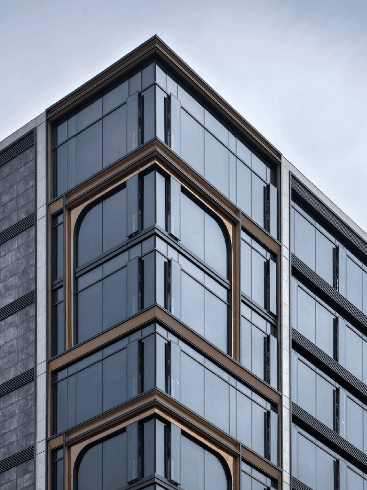 璞云东方同样首创了「飞虹屏」,在错层立面上设计了一湾金色弧线,犹如一座金色拱桥,让整个建筑在阳光下熠熠生辉。形成“金弧云境”的独特视觉体验,和IFC的“上帝的R角”异曲同工。