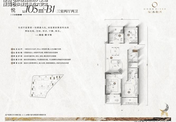 沐新月作为M55系第三个作品,以林汐美学为源点,承袭大水院美学、夜行者美学、疏密相间的漂浮美学等经典元素,更是因地制宜,打造无界自然的水岸森居,环绕建筑的都会森林、环绕园林的美学潮汐、环绕水景的漂浮岛屿的三重景观美学,理想生活如新月变幻,迭新不息。