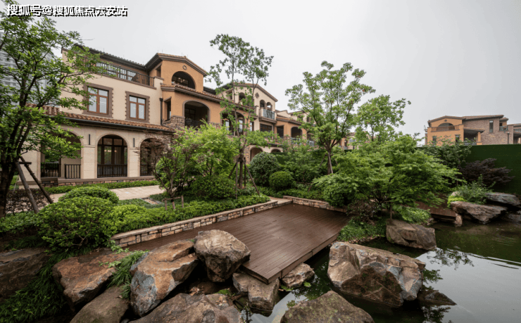 红瓦米墙、坡顶拱门、铁艺雕花等元素复刻南加州度假风格,坡地错落布局保证每户视野通透性与私密性。