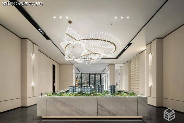 在界面的不断起伏与流动中,沙盘之上的艺术吊灯以丰富的光影与流线造型,呼应空间的流动感受。盘旋的形体,亦成为了另一种凝固的动态存在。