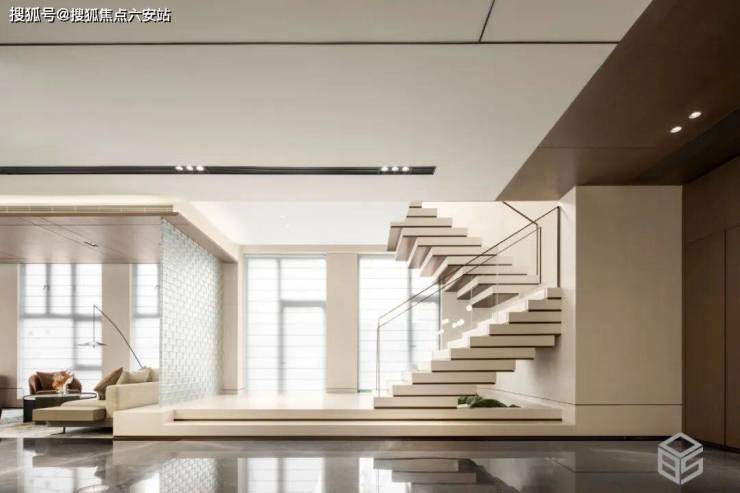 名家艺术作品的网红“斯卡帕楼梯”成为经典的视觉符号,在自然光线的氤氲下散发出生机。一旁整面的玻璃砖将空间区隔为两个世界,一面是烟火人间,一面是艺术世界。