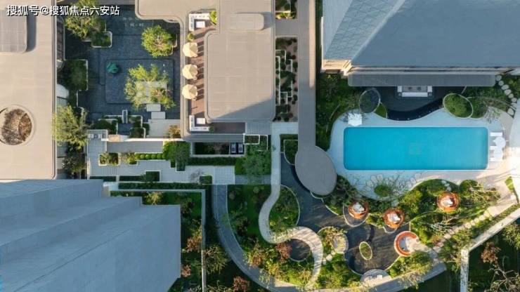 其中“一心”所指的,正是绿城首度落地的3.0泳池综合体。这一空间位于社区核心,归家必经之路上,融合中心泳池、林下客厅、卡座与廊架,成为串联生活场景的视觉与功能中心。