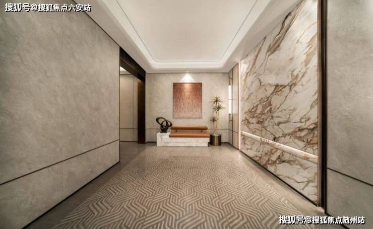 比如它的单元大堂,地面不是简单通铺,而是用上了定制波浪纹地砖,再用弧形金属波打线收边,质感特别高级。