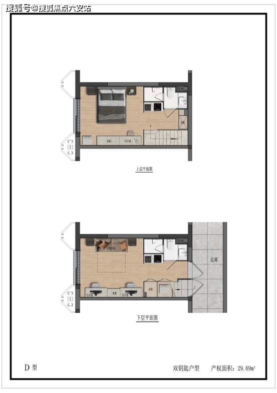 功能分区:下层为开放式厨房+客卫,上层为私密卧室+衣帽间;