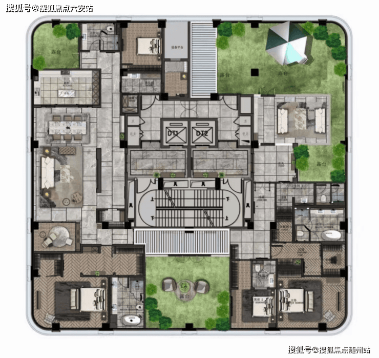 二楼带景观露台,顶楼空间则奢侈到夸张,490m²五房,一层一户送三个露台,比传统的300m²地上三层地下二层的别墅还舒服。