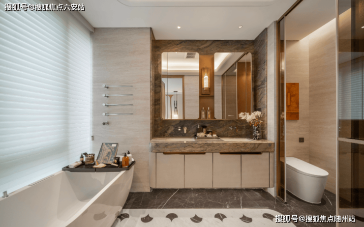 智慧家居系统融入日常生活。项目配备华为鸿蒙全屋控制系统,支持声纹识别入户,一键切换6种生活场景。主卫镜柜内置美妆冰箱,镜柜内吹风机架与充电插头预留,柜下开放随手收纳,满足细致化生活需求。