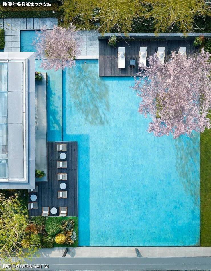 活力剧场里设计了湛蓝的景观戏水池,水岸布置茶几休闲躺椅、还种上了一大一小两株樱花树,度假感直接拉满。