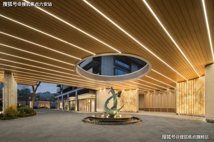第一眼便是目前大宅新盘同款的奢阔大门,望宸映澜不仅尺度宽阔大气,伸出的酒店式迎宾门头深深向外挑出,其后环岛落客区中间一组雕塑叠水与背后的透光奢石景墙形成对照,像极了奢华的酒店落客大堂,将仪式感直接拉满。
