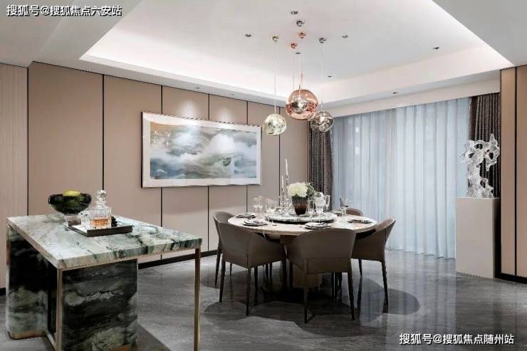 方正的餐厅,放下一张大圆桌的同时,还布置了时下非常流行且实用的“空间中岛”,以后用来做酒吧台、早餐台,都非常方便。一边备菜做饭,一边布置餐桌,非常有画面感!