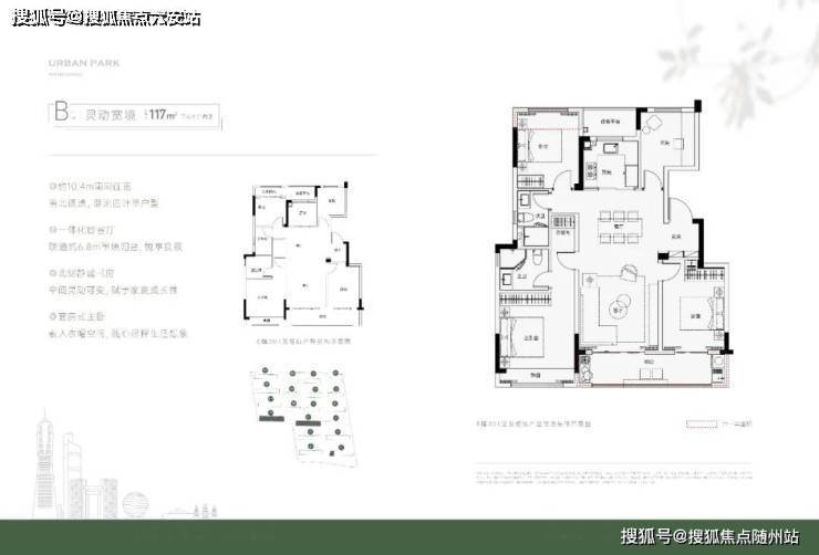 而(建面约)118方户型为经典四叶草格局,南向三开间,面宽达到了约10.4米,客厅与次卧贯通的长阳台近6.8米长,观景休闲、惬意无边。
