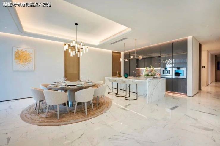走入挑高的电梯大堂,坐着连墙面都是皮质饰面的电梯,来到私家独享的门厅庄重又大气。整套样板房让我印象深刻的是中岛台的设计。