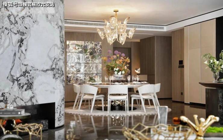 东区建面约320户型,将艺术感进一步融入日常中。特别设计的专属门厅空间,是从电梯厅延伸到家,如同一处艺廊,放慢人的情绪;室内选用了浅金色奢石(外界也称其为“芬迪白大理石”)作为主要的石材,曲面的木饰面也为浅色,整体给人以明亮感。