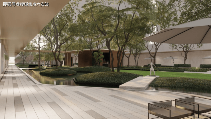 漫步其间宛若穿行于“城市森屿”,大面积的水系铺陈,似将整座庭院置于“水面”。